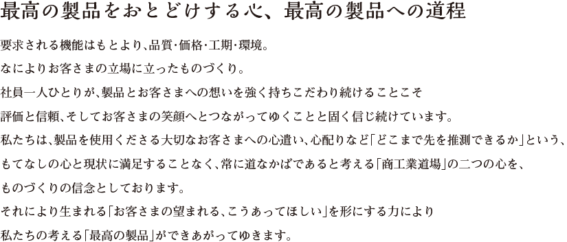 創業から80年に近くなりますが、大手自動車メーカーや日本を代表する大企業からの認証も多くいただき、また防衛省からも1959年(昭和34年)から指定工場の認定をいただき防衛関連用品も今も数多く生産しております。これからはさらに技術に磨きをかけ、他社にできない製品をこれからもチャレンジし続けます。